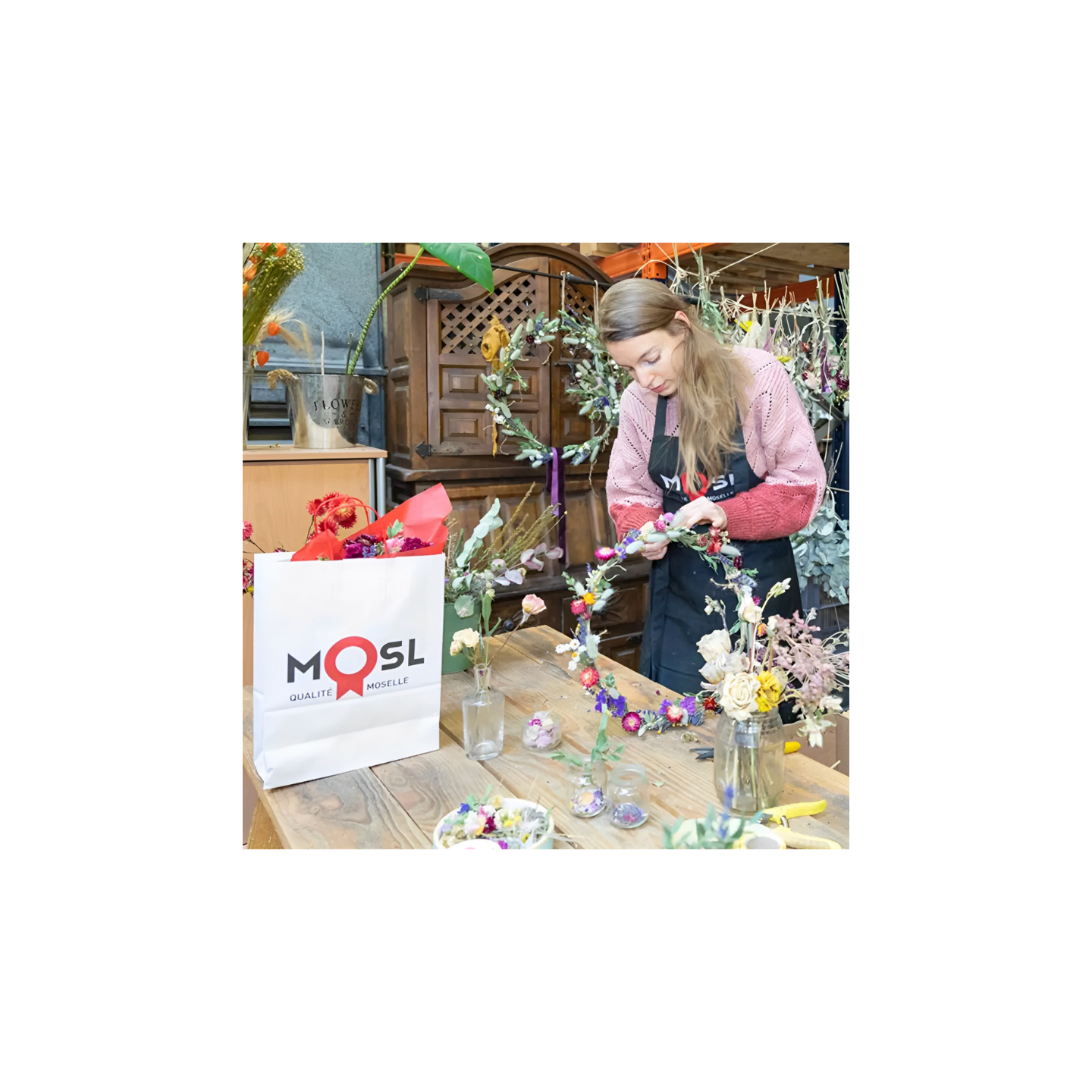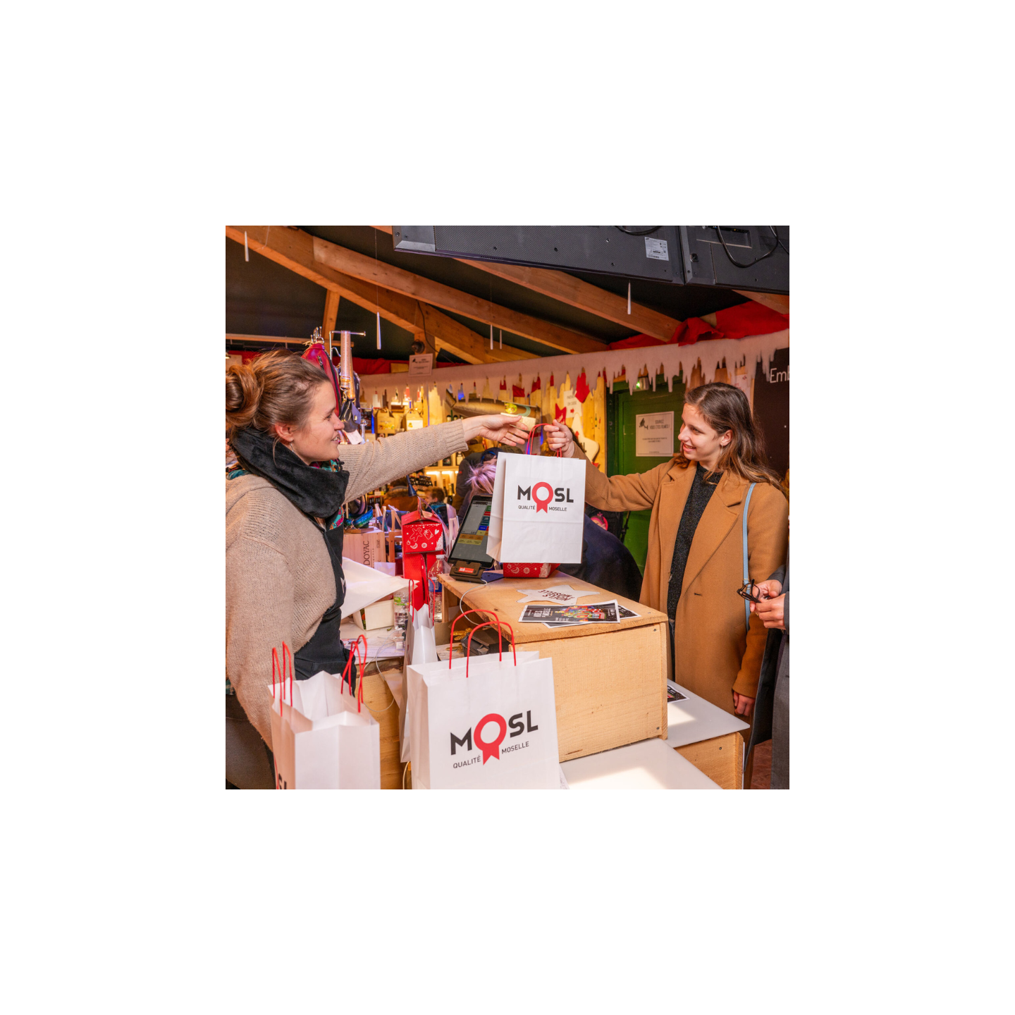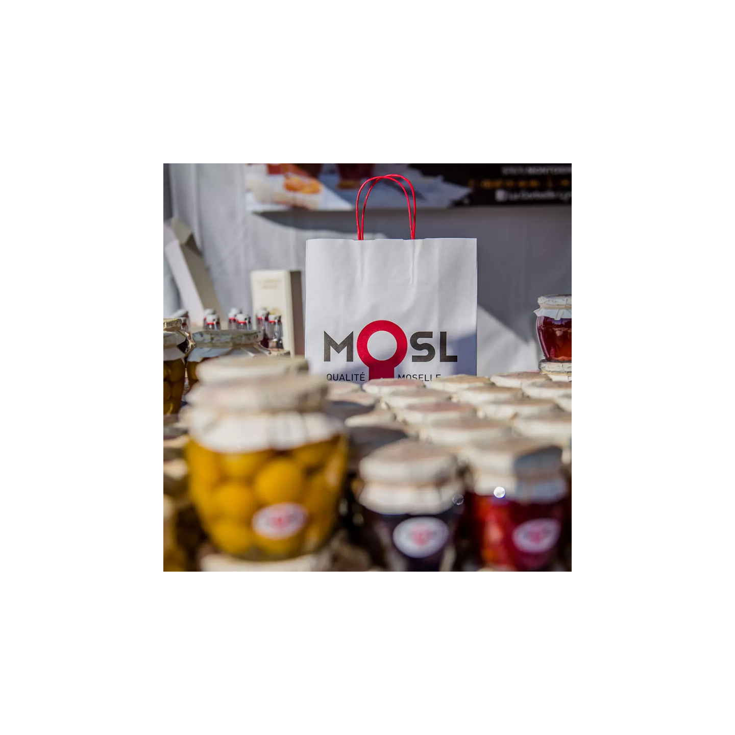 Sachets kraft blancs lisses avec le logo Qualité MOSL imprimé, dotés de poignées en papier torsadé rouge. Vendu par carton de 250 unités.