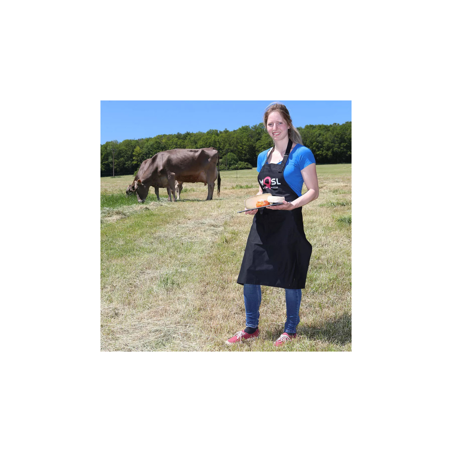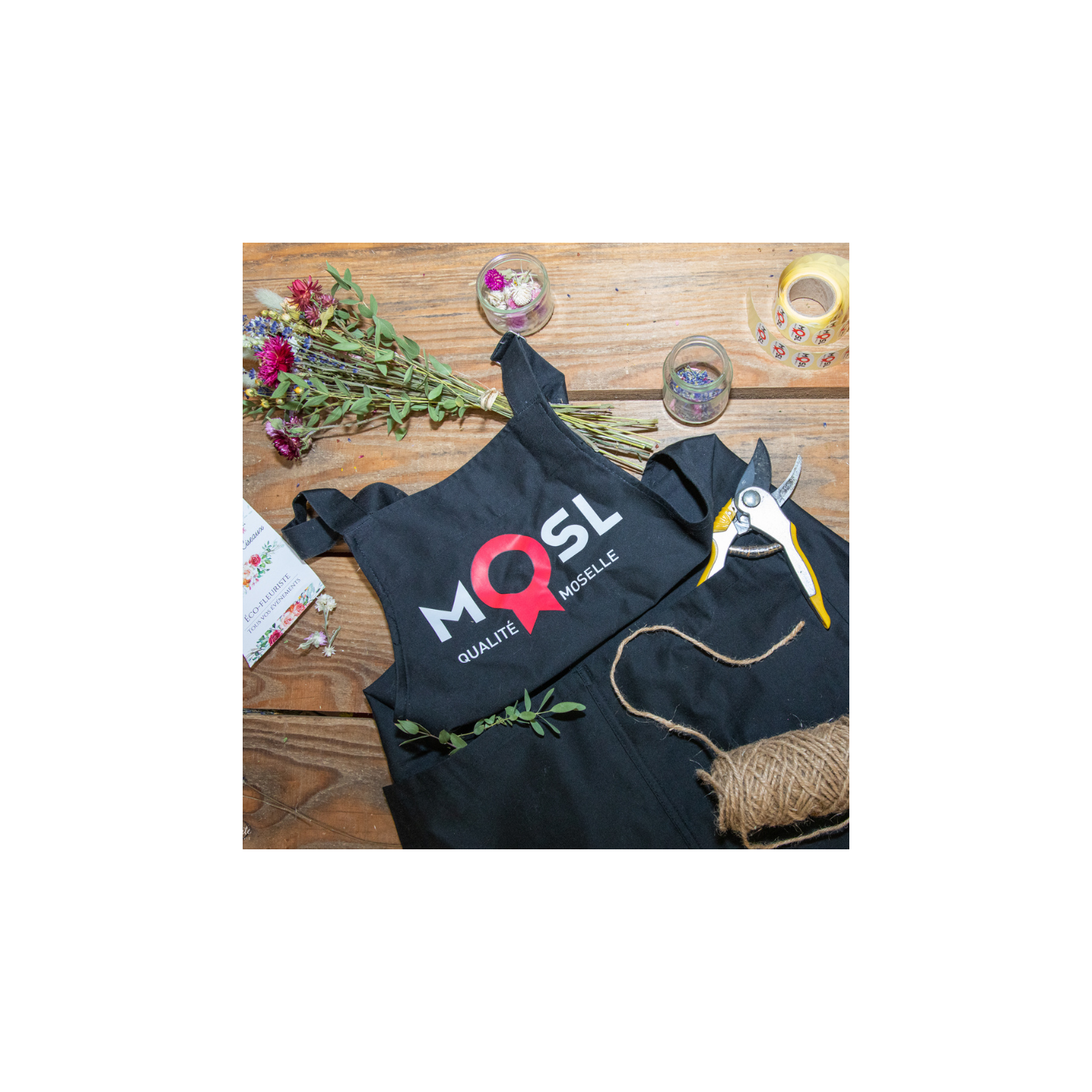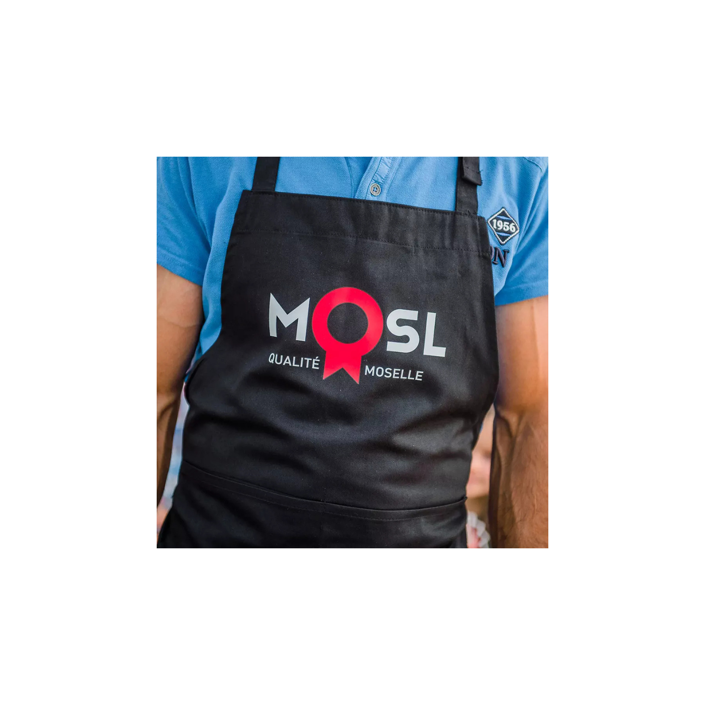 Tablier noir marqué Qualité MOSL, pratique et élégant, avec une grande poche avant à deux compartiments et un ajustement facile à l'encolure grâce à un passant métallique.